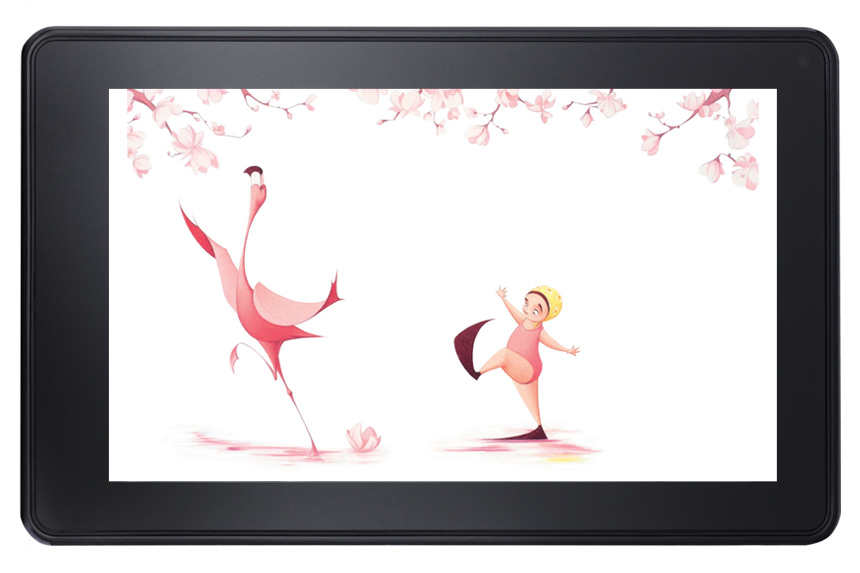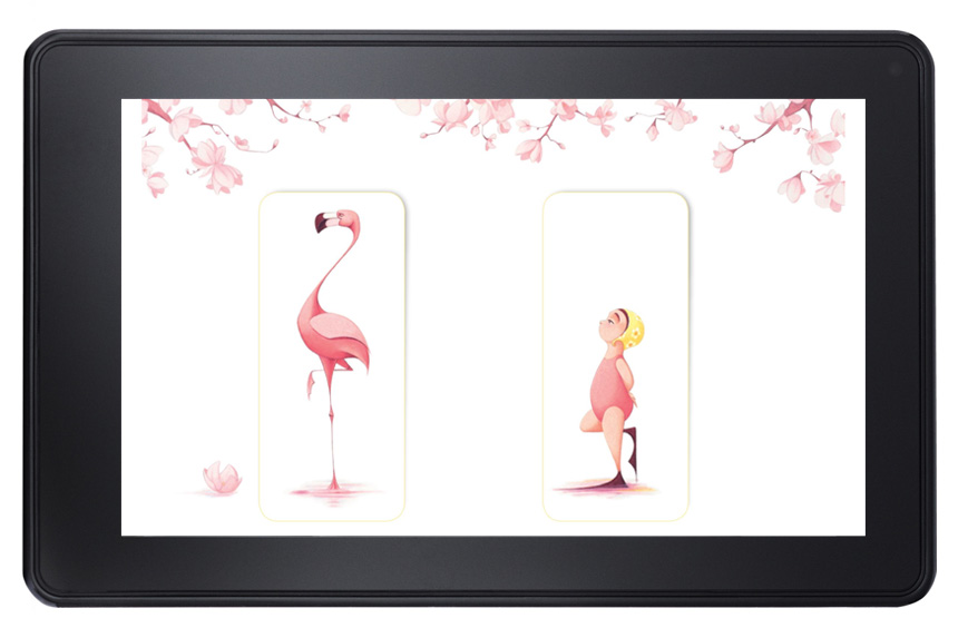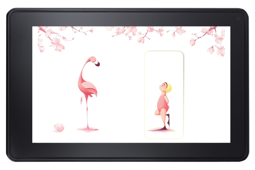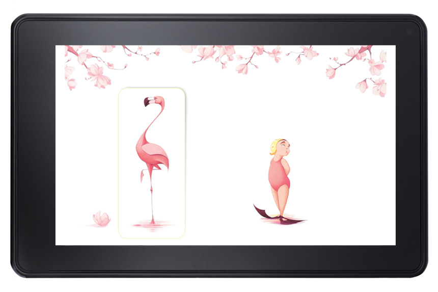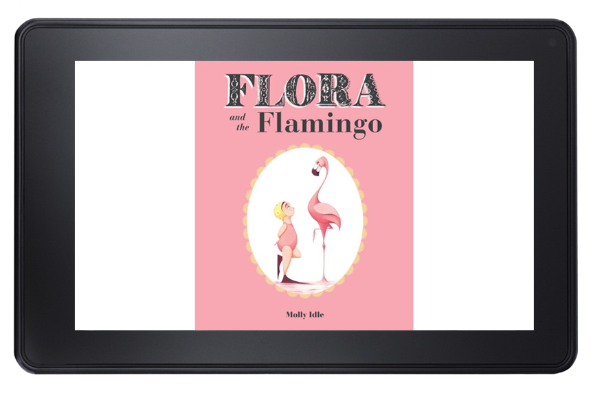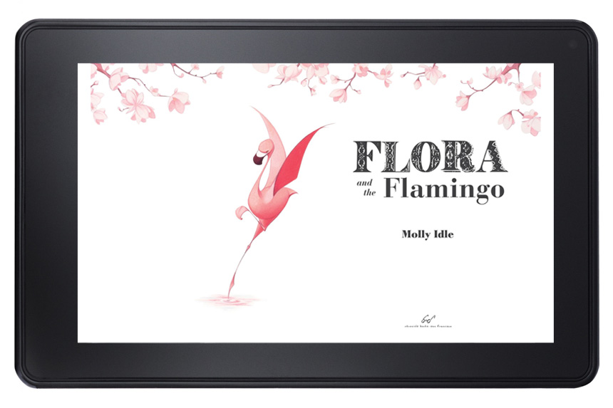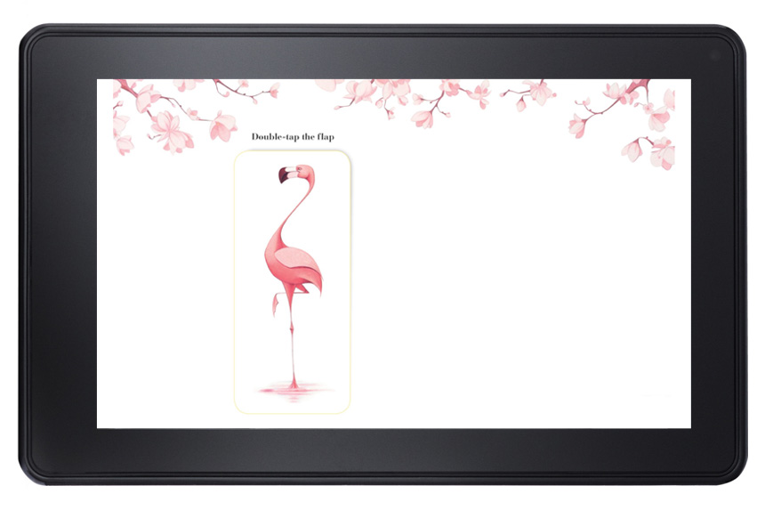 Flora and the Flamingo by Molly Idle is wordless picture book, whose story of a little girl, Flora, and her graceful flamingo friend is revealed slowly in the physical book through paper flaps. The challenge in creating the digital book was retaining this interactive quality so that the reader still feels like a silent participant in the call and response aspect of their dancing. The idea of the flaps were retained in the fixed format version, and the user could simply double-tap to reveal the flap.