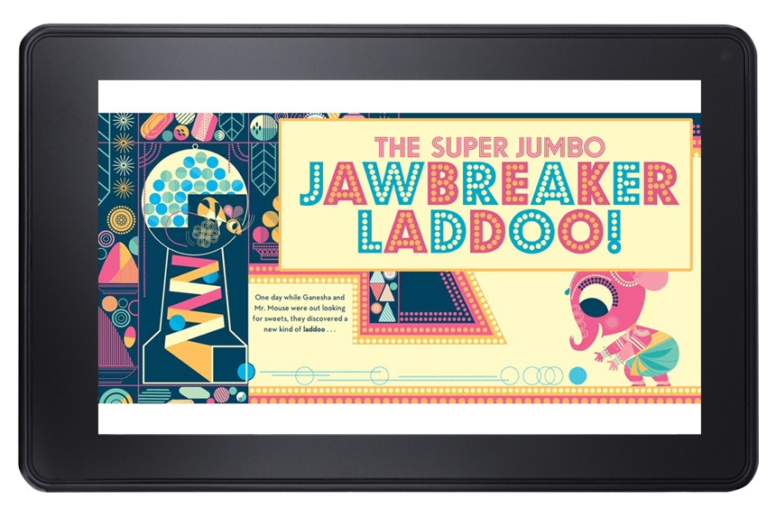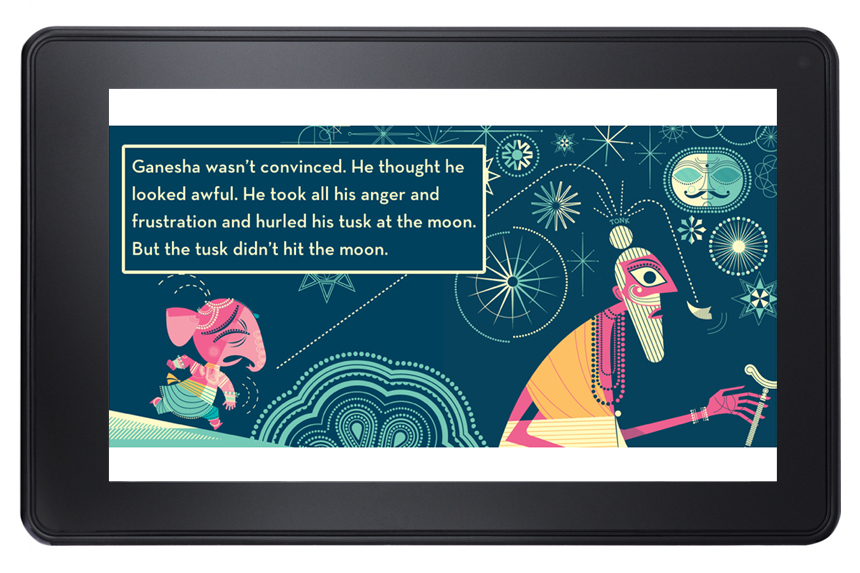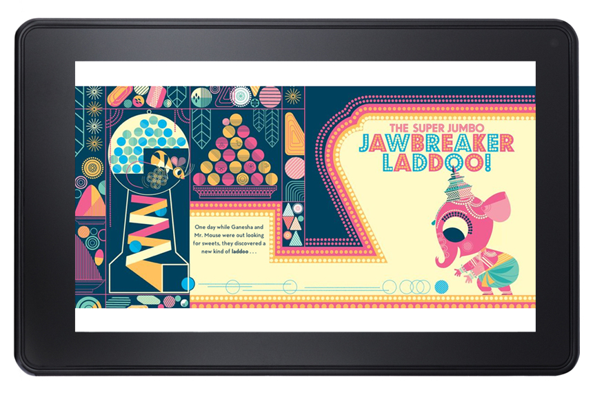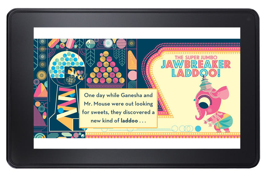 During my fellowship with Chronicle Books, I worked with several children’s titles to translate the physical book into a digital reading experience. Using Amazon’s Fixed Format platform, I developed books from the ground up, allowing me to customize text pop-ups to match the aesthetic of the artwork. Ganesha’s Sweet Tooth (by Emily Haynes and Sanjay Patel) is a lovely story with beautiful illustrations, and I wanted to honor that feeling by styling the popup windows from the default white background and gray border to match the colors from the artwork.
